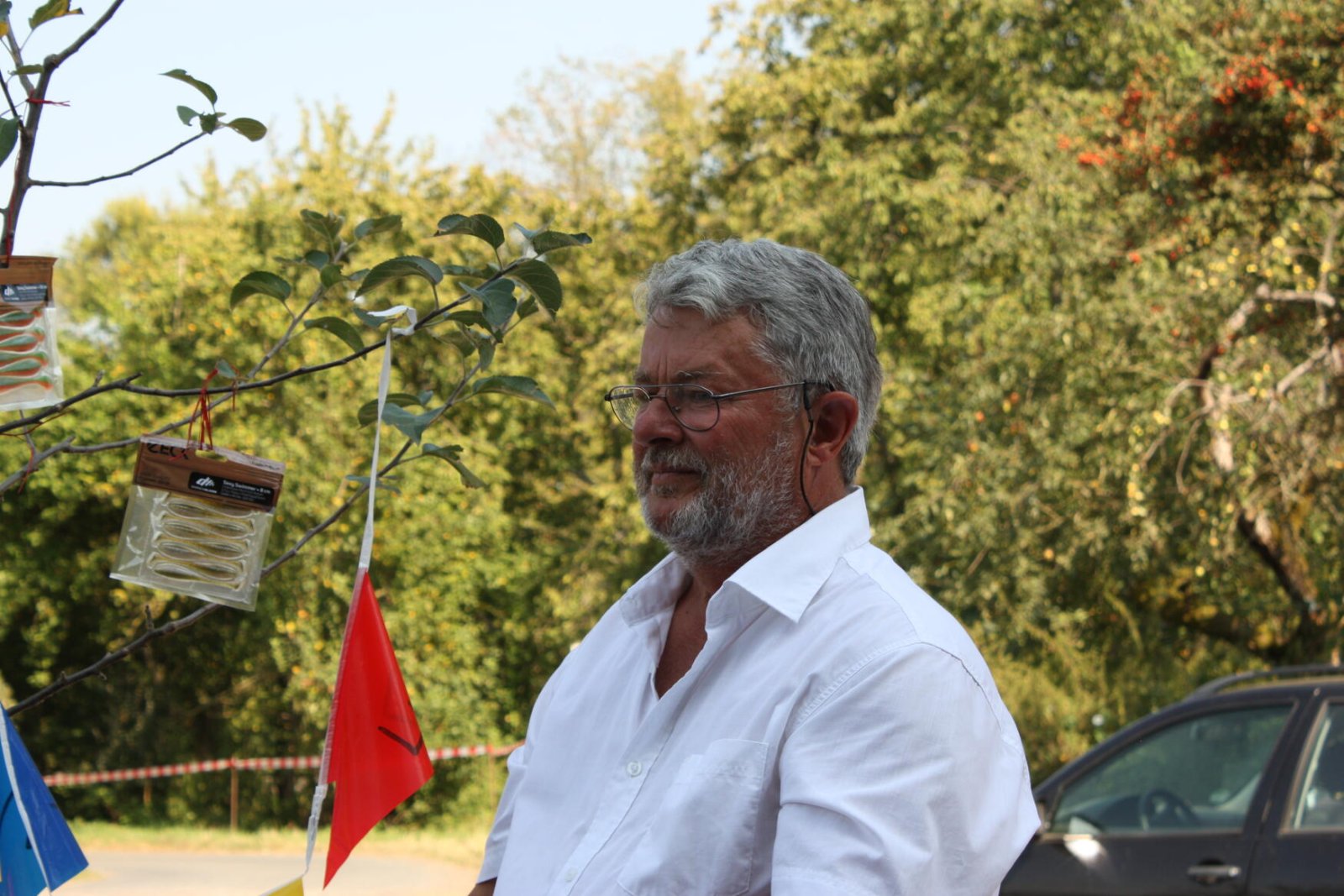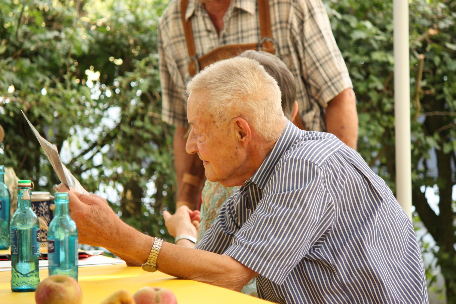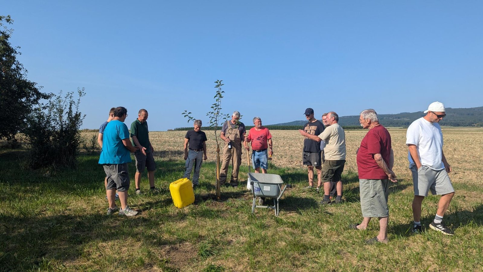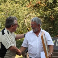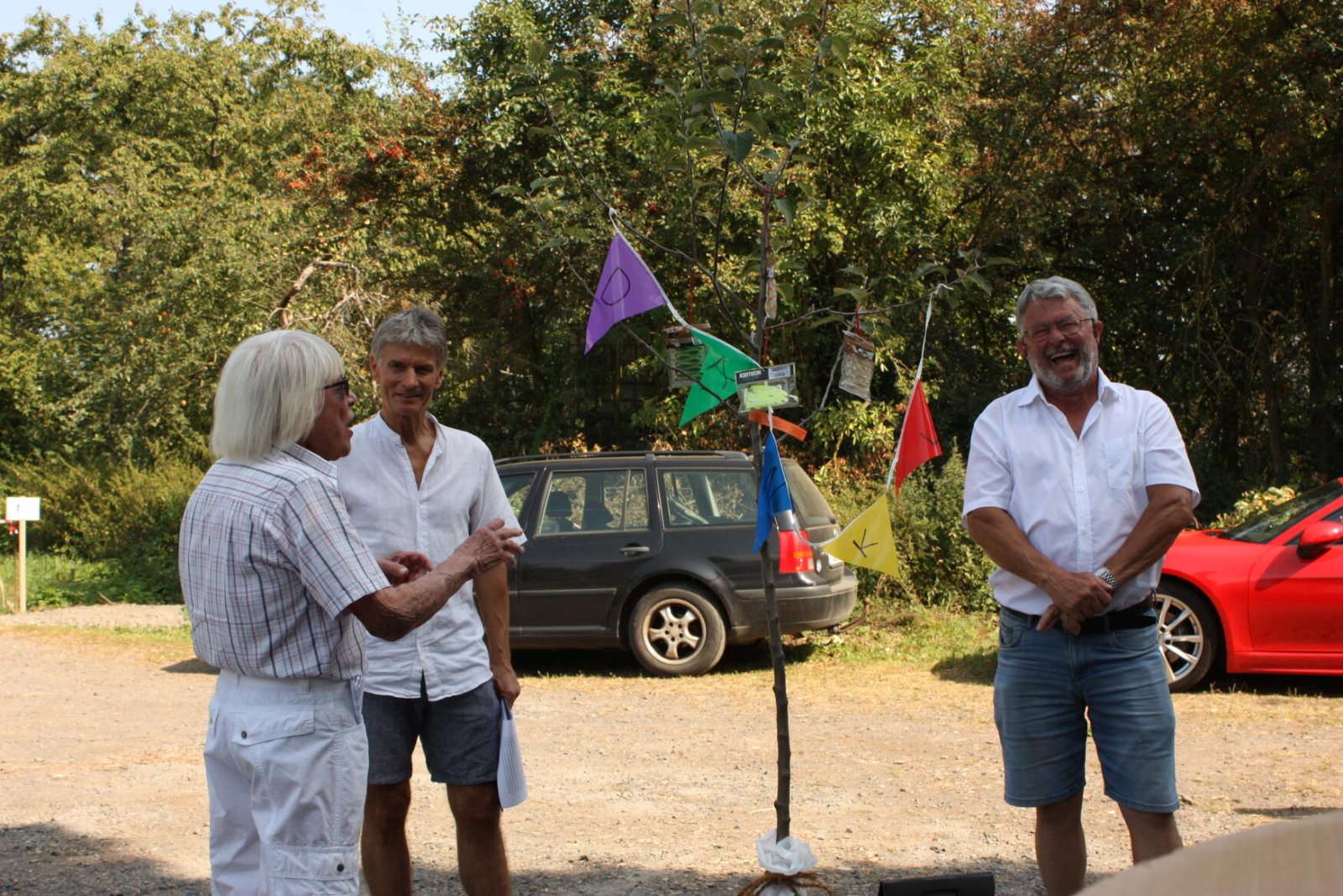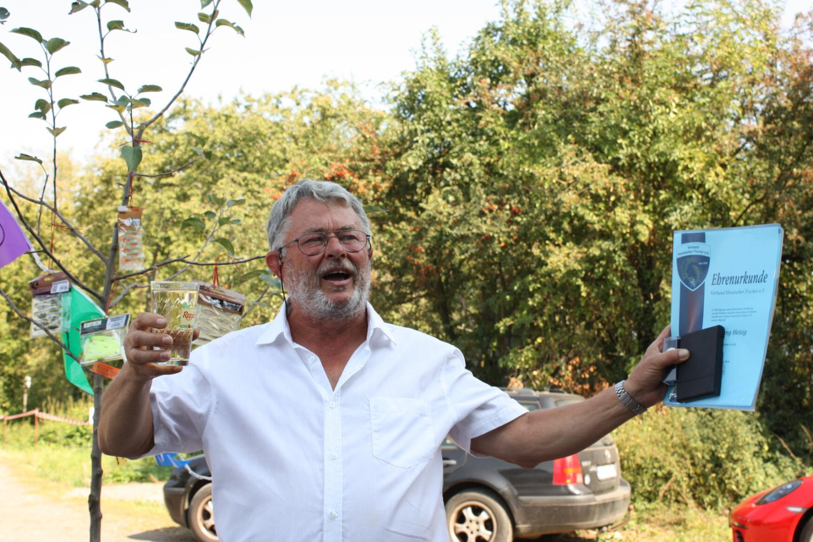 Bei ebenfalls wunderbar schönem Wetter, konnte der seit April neu gewählte 1. Vorsitzende des ASV, Dr. Michael Hübner, zahlreiche Gäste, Mitglieder, Behörden- und Verbandsvertreter und Vorstandsmitglieder benachbarter Angelvereine begrüßen. Unter anderem die 93 jährige Mutter von Wolfgang Heisig, Frau Leni Heisig, in rüstiger Gesundheit, neben Herrn Stadtrat Simmer, der in Vertretung des Bürgermeisters von Friedberg, Herrn Dahlhaus, herzliche Grüße und eine Spende überbrachte. Von besonderer Freude war auch die Teilnahme des ehemaligen Bürgermeisters von Friedberg, Herrn Dirk Antkowiak, mit dem der ASV Friedberg während seiner Amtszeit immer hervorragend zusammengearbeitet hat, sowie Frau Paulenzen als amtierende Bürgermeisterin von Ober Mörlen. Ebenso herzlich begrüßt wurde auch Herr Schwebel vom Verband Hessischer Fischer e.V., der Wolfgang Heisig in Würdigung seiner besonderen Verdienste um die Fischerei und den Naturschutz in Hessen, das Verdienstabzeichen in Gold, eines der höchsten Auszeichnungen des Verbandes, sowie im Namen des Präsidenten des Deutschen Angelfischerverbandes e.V., die silberne Ehrenmedaille überreichte. Seitens des Angelsportvereins Friedberg, war es Michael Hübner im Namen aller Vereinsmitglieder eine besondere Freude, in Anlehnung an die Lebendigkeit von Wolfgang, ihm einen stattlichen Apfelbaum zu überreichen, der anschließend auf dem Vereinsgelände gepflanzt und getauft wurde.